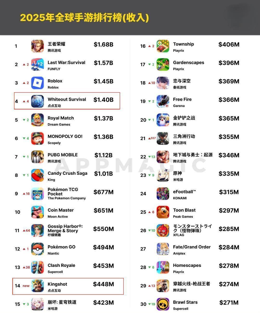 特别是《Whiteout Survival》,这款4X策略手游在2025年表现出色,排名较上年上升了4位,稳居全球手游收入榜的第4位,AppMagic指出,该游戏全年展现出极强的营收稳定性,在2025年3月更是创下了月度收入纪录。