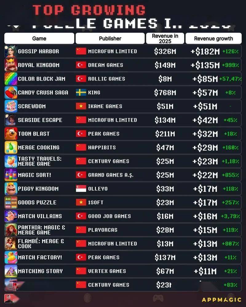 值得一提的是,2025年的新手游市场,呈现出了多元化的趋势,根据AppMagic统计,2025年收入最高的15款新手游中,亚洲的游戏公司继续占据了主导地位,而中国厂商的表现尤为突出,在前15名中,占据了7个席位。
