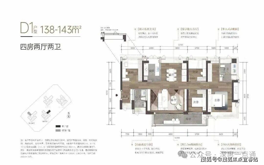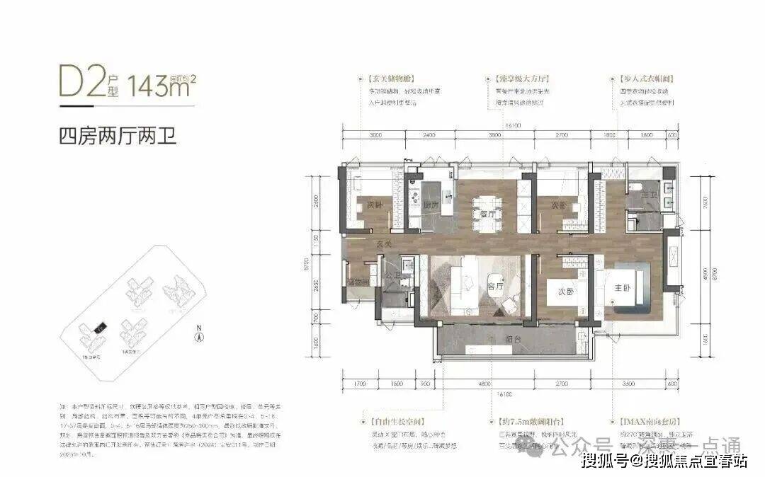 143㎡的4房2厅2卫,D2/1栋4单元01户型,设计的是横厅南北通透格局,客厅5.7米开间,分别做到了主卧28.18㎡/次卧9.6㎡/次卧9.04㎡/次卧8.64㎡(包含墙体飘窗),外带1个储物间约4.5㎡,主卧大套间设计,7.5米长的超大阳台约12平,L型厨房,得房率:81.49%(不含赠送),阳台主朝西南或东南向。