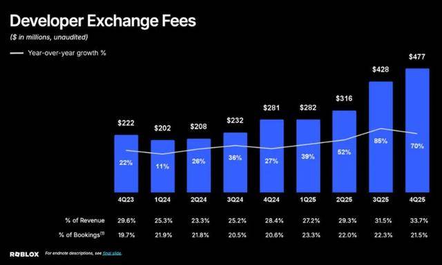 2025年,Roblox上的开发者分成达到了15亿美元的里程碑,同比增长70%。仅在第四季度,就有4.77亿美元分发给了创作者。显然,更高的参与度助力了更高的分成,但该计划的额外推动力还包括: