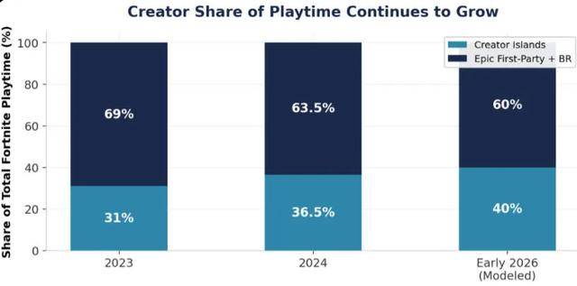 Fortnite Creative中最令人鼓舞的信号之一,是内容正逐渐且切实地从以战斗为中心向多元化发展。2023年,创作者内容仍主要由战斗模式主导:箱型格斗、区域战争、瞄准训练以及大逃杀变种模式。到2024年,Epic报告称,Fortnite Creative中30%的参与度来自非射击类体验。到2025年初,这一比例已增长至玩家在创作者岛屿上花费时间的约三分之一,其中社交RPG、派对游戏、死亡跑酷、恐怖体验和创意建造模式是推动这一增长的主要力量。
