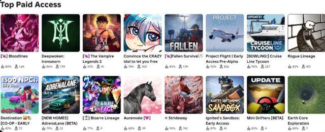付费访问:这项允许开发者对游戏入口收取真实货币(这些付费游戏可获得50%-70%的收入分成)的举措,其采用率要低得多。大多数开发者仍倾向于采用免费模式,以扩大用户范围。目前,付费访问主要被用作beta测试的门槛,确保只有最投入的用户参与早期开发。顶级付费访问排行榜的参与度极低,因为大多数创作者默认选择免费模式。
