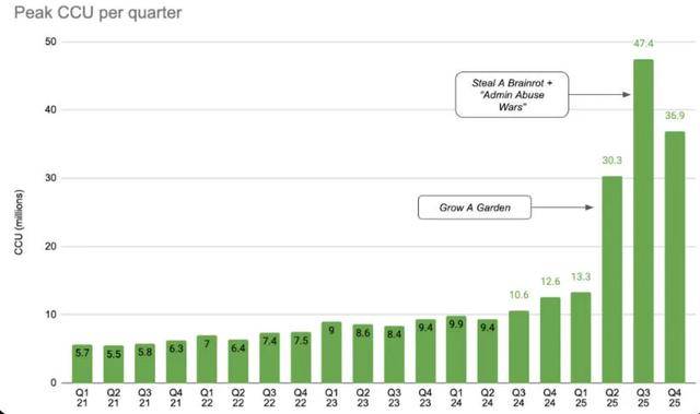 2025年是Roblox的又一个拐点。《种个花园(Grow A Garden)》和《偷个脑腐(Steal A Brainrot)》等游戏成为游戏史上玩家最多的游戏(按同时在线人数衡量)。它们还加速了Roblox的整体增长。日活跃用户和预订量同比分别增长52%和55%,目前Roblox占全球游戏收入的3.4%。在由网络效应驱动的行业中,赢家往往会持续获胜。Roblox未来几年可能不会再现2025年那样的爆发式增长,但其日益增长的优势,从其社交结构和创作者社区,到将在研发和资本支出上共同投入的数十亿美元,都将不断增强。