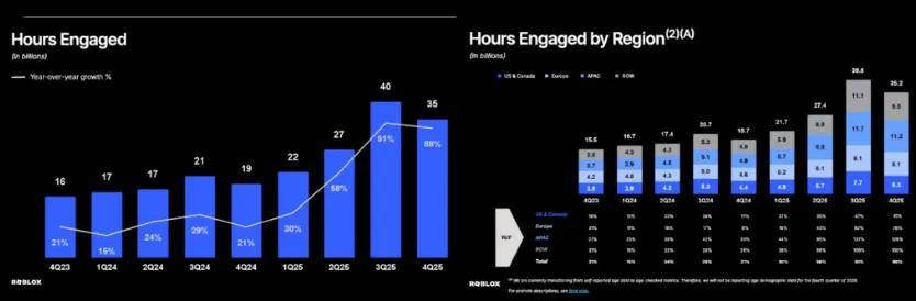 2025年全年,Roblox的用户参与度(以总游玩时长衡量)从2024年第四季度的190亿小时增长至2025年第四季度的360亿小时,增幅达88%。为了更直观地体现这一规模,在第三季度和第四季度合计期间,Roblox的用户参与时长达到750亿小时(约每月125亿小时)。这一数字超过了Steam和