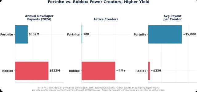 相比之下,Roblox在2024年向开发者支付了9.23亿美元,并在2025年前9个月突破了10亿美元。从绝对值来看,《堡垒之夜》的支付总额约为Roblox的40%,不过从每位创作者的角度计算则大相径庭。《堡垒之夜》每位创作者的年均收入约为5000美元,是Roblox的约35倍(尽管对“活跃”创作者的技术定义和支付结构有所不同),这既反映出其创作者基数更小,也体现出收益分配更为集中。