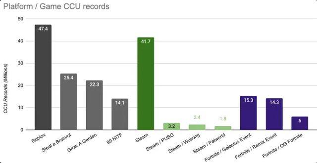 《种个花园》在8月的“管理员滥用战争”活动中“获胜”,其同时在线万。《偷个脑腐》最终在2025年10月达到了2540万同时在线用户,夺得“史上同时在线人数最多的游戏”称号。