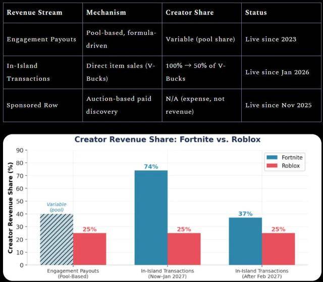 内购作为核心游戏设计,而非事后补充:岛屿内交易不会简单地增加一个收入层;它们将重塑创作者设计《堡垒之夜》游戏的方式。预计最资深的创作者会将应用内购买融入核心游戏进度循环中,激励玩家为自己喜爱的游戏付费,以解锁内容、加速进度或获得优质体验。这与移动免费模式的策略相呼应,那些在100%收入分成窗口期掌握这一策略的创作者,在2027年2月分成比例降至50%时将拥有结构性优势。其经济效益十分可观:即便在分成比例调整后仅占零售收入的37%,《堡垒之夜》创作者的分成仍超过《Roblox》的25%。