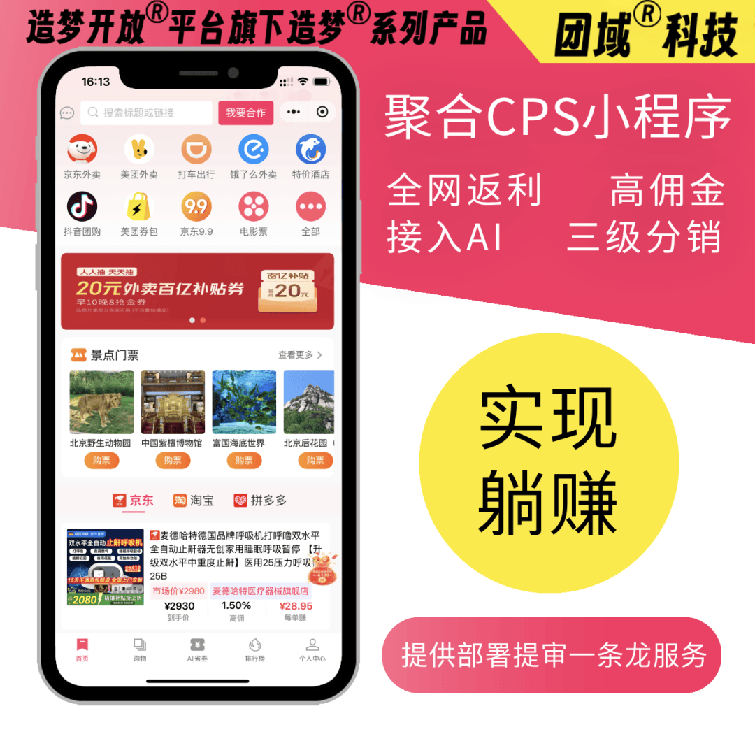 造梦®聚合CPS优惠系统:整合外卖、打车、购物、充值等全网高频消费场景的优惠与佣金,打造全渠道、一体化的省钱与赚钱平台。