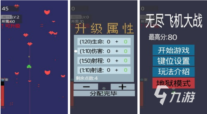 这是一款控制飞机闯关的小游戏,属于那种打开就能玩的单机游戏。这款游戏独特的地方在于飞机可以升级,每击落一架敌机就能获得一点经验,升级后的飞机可以用技能点提升属性,比如增加飞机的生命值或者伤害。游戏里的地狱模式是刷经验的好地方,有无数架敌机会围攻玩家!